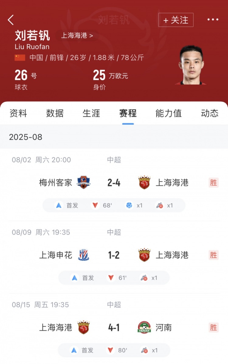 在8月已经进行的3场比赛中,上海海港先后战胜梅州客家、上海申花和河南队。其中刘若钒在对阵梅州的比赛里贡献1传1射,其他2场比赛则各有1个助攻。